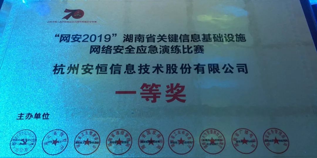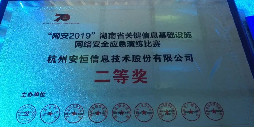 11月28日,2019湖南(长沙)网络安全·智能制造大会在长沙国际会展中心正式开幕。作为本届大会的重要活动之一,会上对2019“湖湘杯”网络安全技能大赛系列活动进行表彰。安恒信息的两支战队,在2019“湖湘杯”网络安全技能大赛系列活动——关键信息基础设施网络安全应急演练比赛中彰显实力,分获一、二等奖。