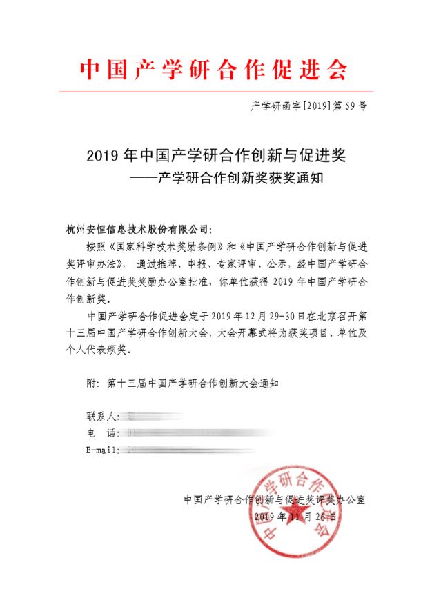 近日,中国产学研合作创新与促进奖评奖办公室发布关于2019产学研合作创新奖获奖通知,安恒信息荣获“2019年中国产学研合作创新奖”。