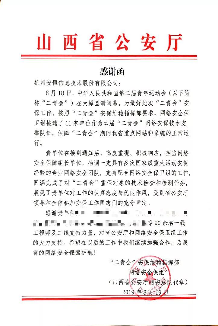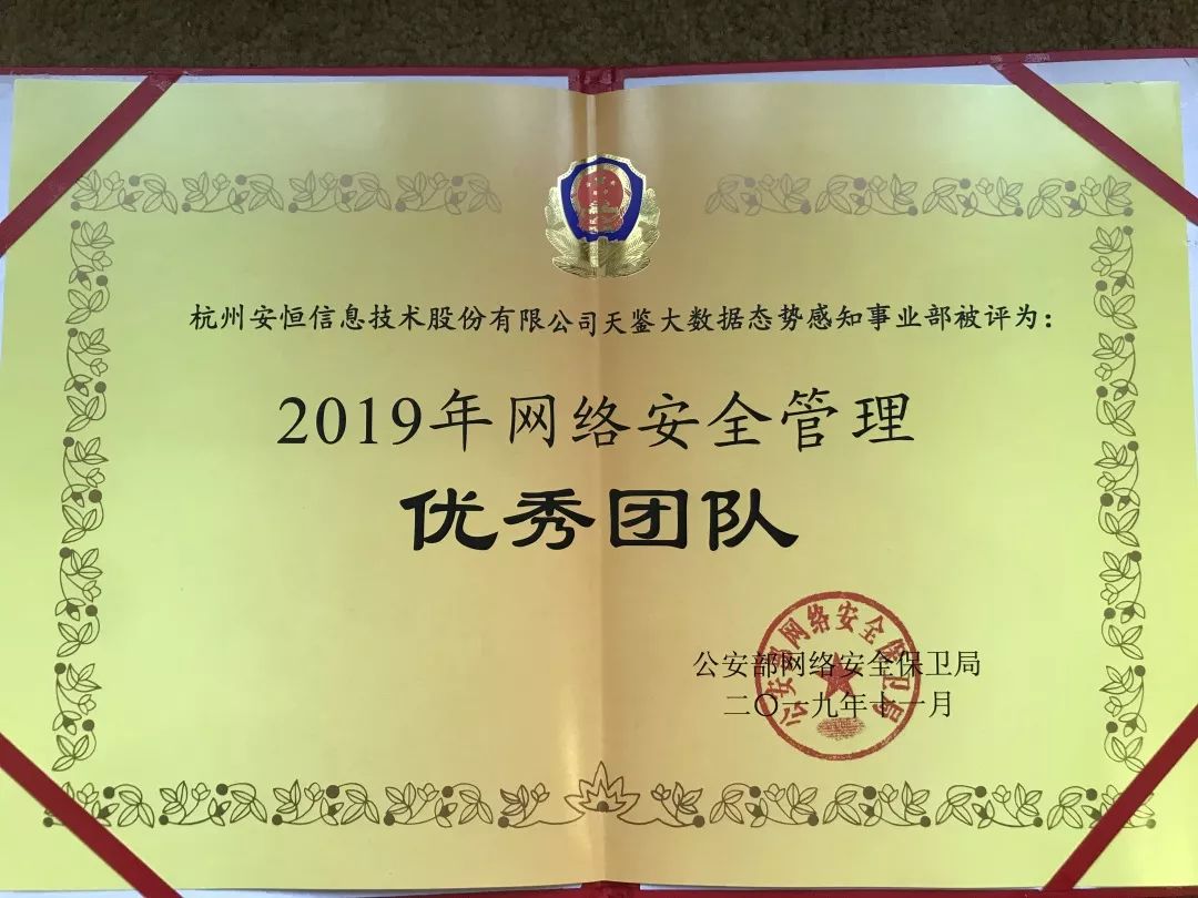 此次再度被公安部评选为“全国互联网企业网络安全管理优秀团队”、“网络安全管理优秀个人”,代表了公安部等领导部门对安恒信息2019年工作的高度肯定和认可。未来,安恒信息也将继续践行“助力安全中国,助推数字经济”的企业使命,一如既往地配合公安部履行一个网络安全公司的责任和担当,尽己所能构筑网络安全防线,保卫国家网络安全。