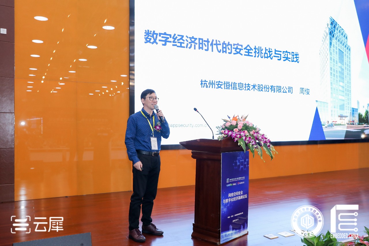 安恒信息智慧城市运营中心总监周俊受邀参加了本次论坛,并进行了《数字经济时代的安全挑战与实践》的主题分享。周俊认为,在数字经济时代,数据成为了新的生产要素,驱动了商业模式的变革,数据安全正在成为新商业模式的重要一环。周俊在演讲中全面分析了当前数据安全面临的挑战,并提出了安恒信息以数据为中心的安全体系建设思路。