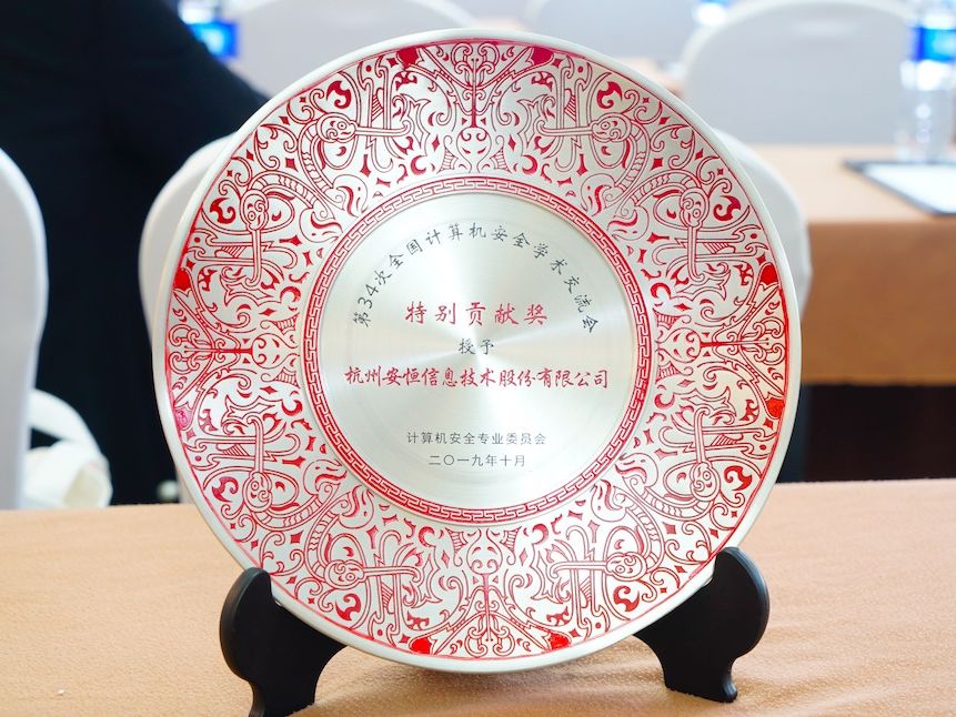 (图:在会议现场,计算机安全专业委员会授予安恒信息“特别贡献奖”。)