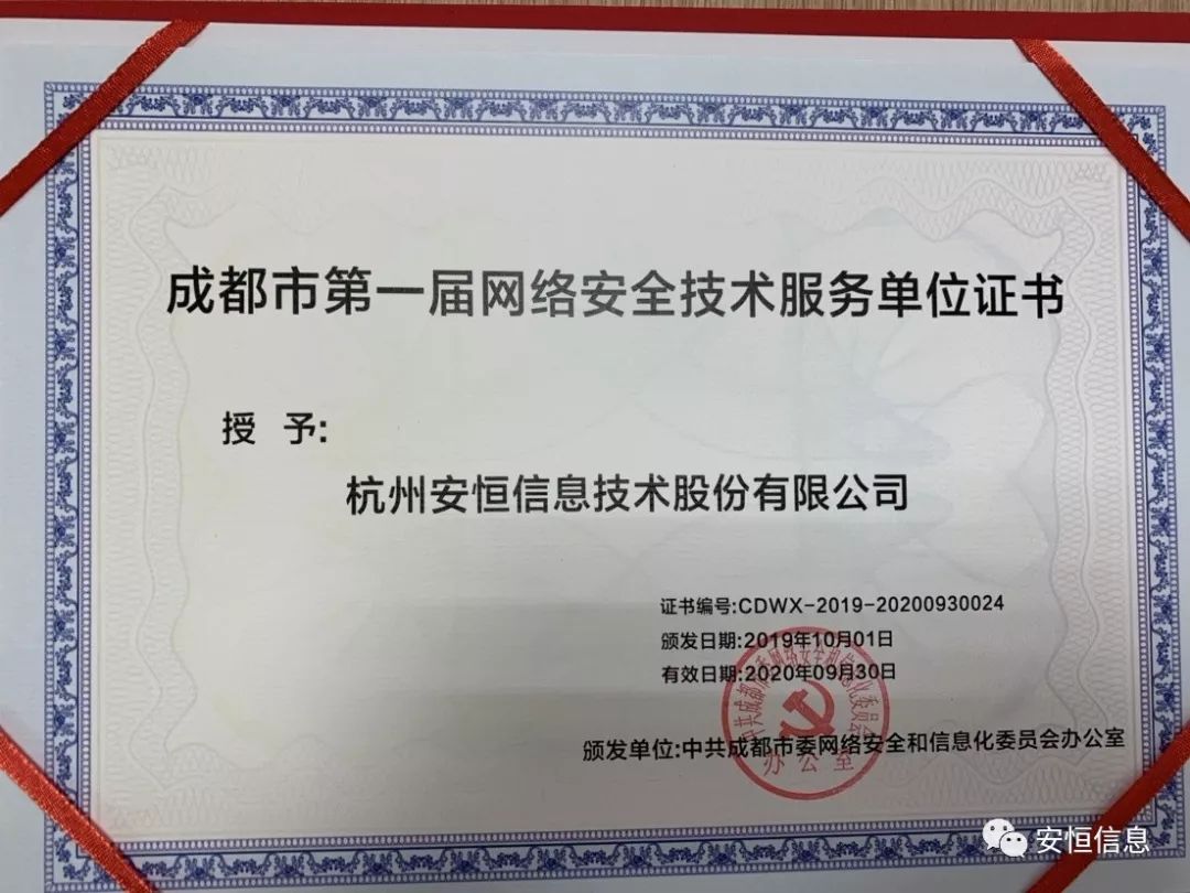 安恒信息入选成都市委网信办第一届网络安全技术服务单位