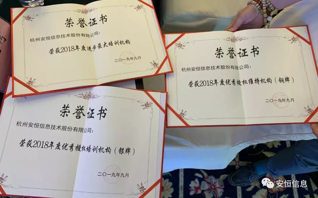 在中国信息安全测评中心的年会上,安恒信息收获了2018年度进步最大培训机构、2018年度优秀授权培训机构(银牌)、2018年度优秀授权维持机构(铜牌)三项奖项!