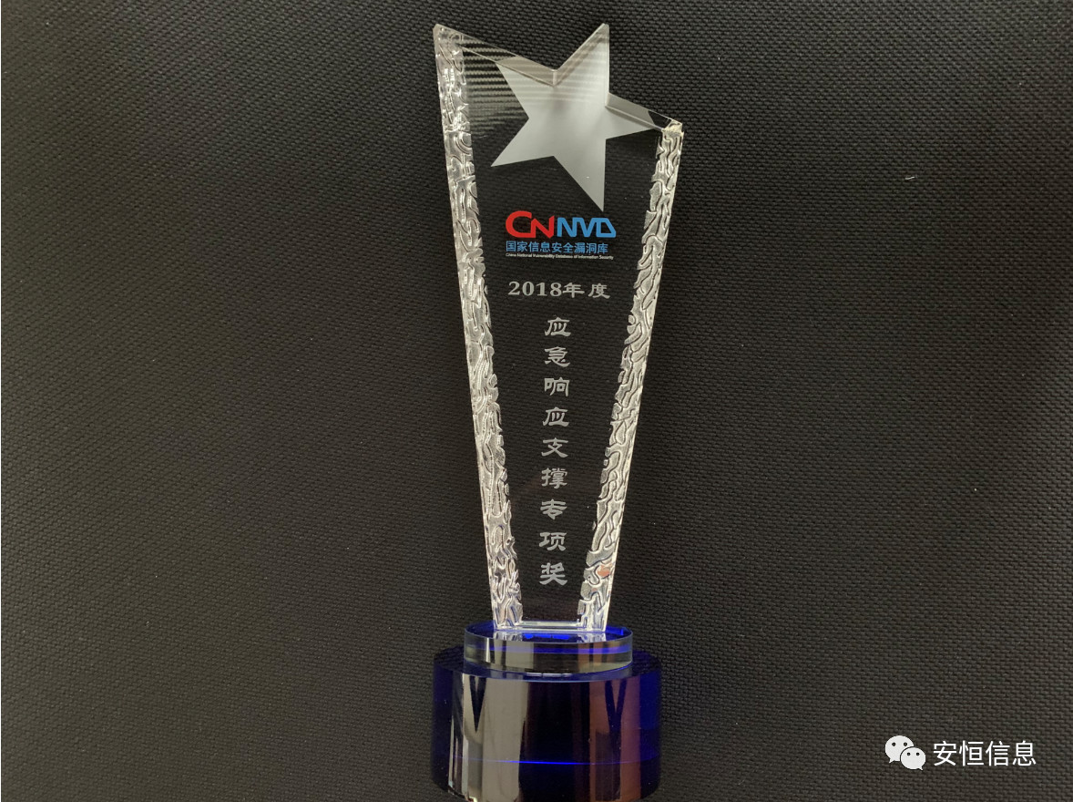 7月26日,2018年度国家信息安全漏洞库(以下简称CNNVD)技术支撑单位总结大会在北京举办,大会对2018年技术支撑单位的支撑工作进行了总结和表彰,安恒信息荣获“2018年度应急响应支撑专项奖”。