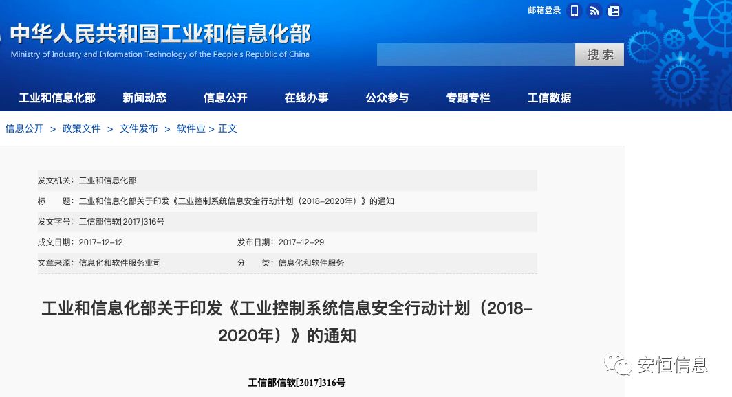 2017年12月,工业和信息化部发布了《工业控制系统信息安全行动计划(2018—2020年)》,提出在工控系统信息安全保障体系建设中,落实企业主体责任,因地制宜分类指导,坚持技术和管理并重等指导策略,以及落实企业主体责任和监督管理责任以提升安全管理水平,建设全国工控安全监测网络和实施信息共享工程以提升态势感知能力,加强防护技术研究和建立健全标准体系以提升安全防护能力,开展信息通报预警和建设国家应急资源库以提升应急处置能力,培育龙头骨干企业和创建国家新型工业信息安全示范基地,以提升产业发展能力等具体措施。