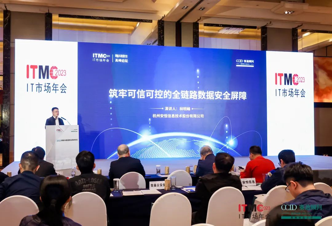现场,安恒信息副总裁林明峰受邀参加2023 IT市场年会-网络与数据安全高峰论坛并作《筑牢可信可控的全链路数据安全屏障》主题演讲。