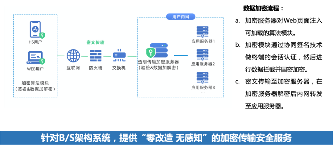 传输透明加密系统聚焦于解决用户业务数据在网络传输中潜在的被窃取和篡改风险,采用国密SM1、SM2、SM3、SM4密码算法,对Web应用进行数据透明加密,并实现应用系统“零改造”对接。