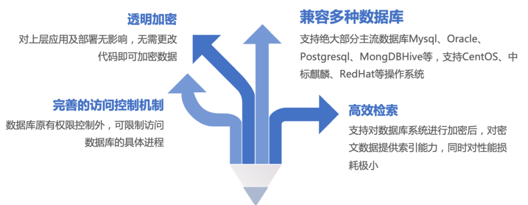 数据库透明加密系统通过将要加密的数据表的数据存储路径配置在具备加解密功能的数据库加密软件中,在设备上写入数据时,加密软件将设备的写入数据第一时间加密后将数据以密文形式写入物理设备,读出数据时也需要先从物理设备读出密文然后解密返回给上层调用方。上层应用访问过程全透明,用户系统无需做任何改动。