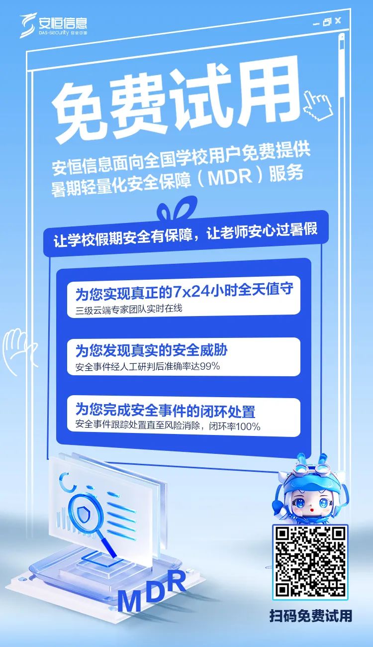 安恒信息面向广大学校用户推出暑假轻量化安全保障服务,协助学校做好全天候网络安全值守、保障工作。