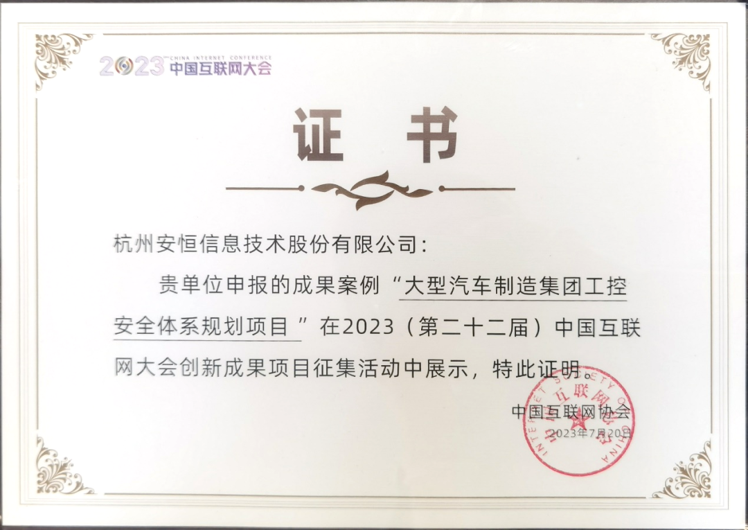 中国互联网大会创新成果|安恒信息“大型汽车制造集团工控安全体系规划项目”入选