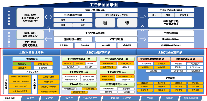 工控安全体系主要包括整体管理要求、项目安全管理、运营安全管理以及风险评估、威胁预警、应急处置相关流程,覆盖工控系统从建设到运营使用全生命周期,形成管理规定、流程、规范等体系文件,根据企业的数字化建设程度,制定具有针对性的工控安全体系。