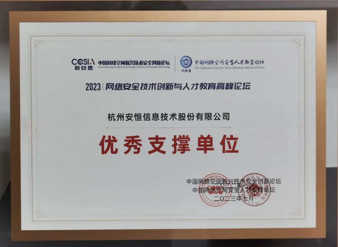 作为新安盟、网教盟理事单位之一,安恒信息参与了论坛多个重要系列活动。安恒信息高级副总裁、首席人才官苗春雨,副总裁、数字人才创研院副院长吴鸣旦分别出席新安盟和网教盟理事会。此外,安恒信息与方班联合打造了与人才培养体系指南相一致的自适应认证平台。会上,安恒信息获评2023网络安全技术创新与人才教育高峰论坛优秀支撑单位。