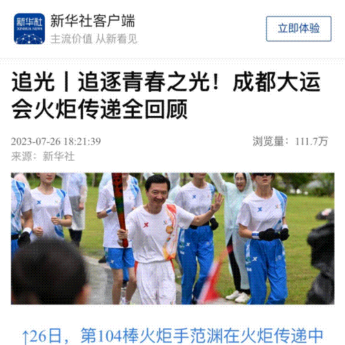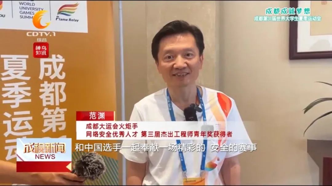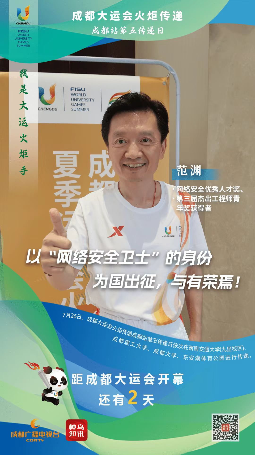 7月26日,成都大运会火炬传递迎来最后一个传递日。“蓉火”途径西南交通大学、成都理工大学、成都大学三所高校后,传递至赛事主场馆所在的东安湖体育公园,并举行隆重的收火仪式。安恒信息董事长范渊作为第104棒火炬手在东安湖体育公园进行接棒传递。