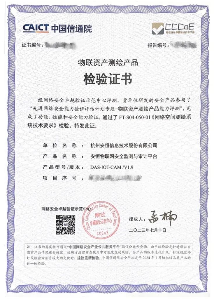 近日,安恒物联网安全监测与审计平台参与了中国信息通信研究院(以下简称“信通院”)组织的“先进网络安全能力验证评估计划专题-物联资产测绘产品能力评测”,完成了功能、性能和安全能力验证。顺利通过FT-SO4-050-01《网络空间测绘系统技术要求》检验,荣获物联资产测绘产品检验证书!