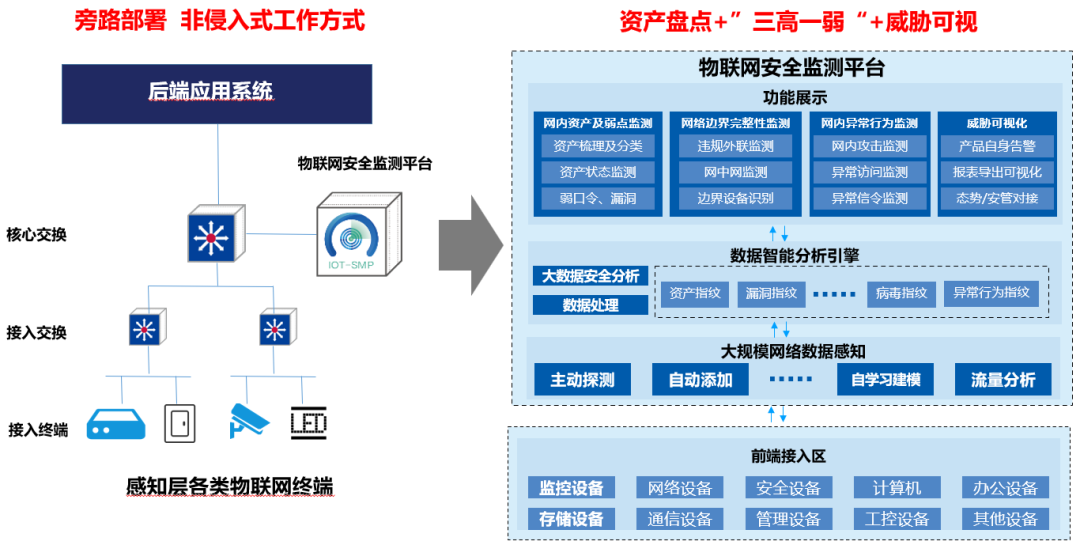 支持违规外联监测、网中网监测;可显示网闸设备、小型路由器、代理服务器等边界安全设备的监测信息。核心优势如下: