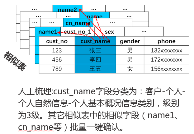 特性:采用无监督的聚类算法,将相似字段/表聚合在一起实现信息整合;在梳理向导功能的辅助下,用户仅需修改其中一项的分类分级信息,即可批量自动覆盖其他相似字段/表的结果,提升人工梳理效率。聚类算法在AiSort的版本迭代中持续优化,聚焦于提供更具实际业务描述能力的信息整合手段,让梳理人员在尽可能短的时间内准确判断当前字段的实际分类和实际分级。