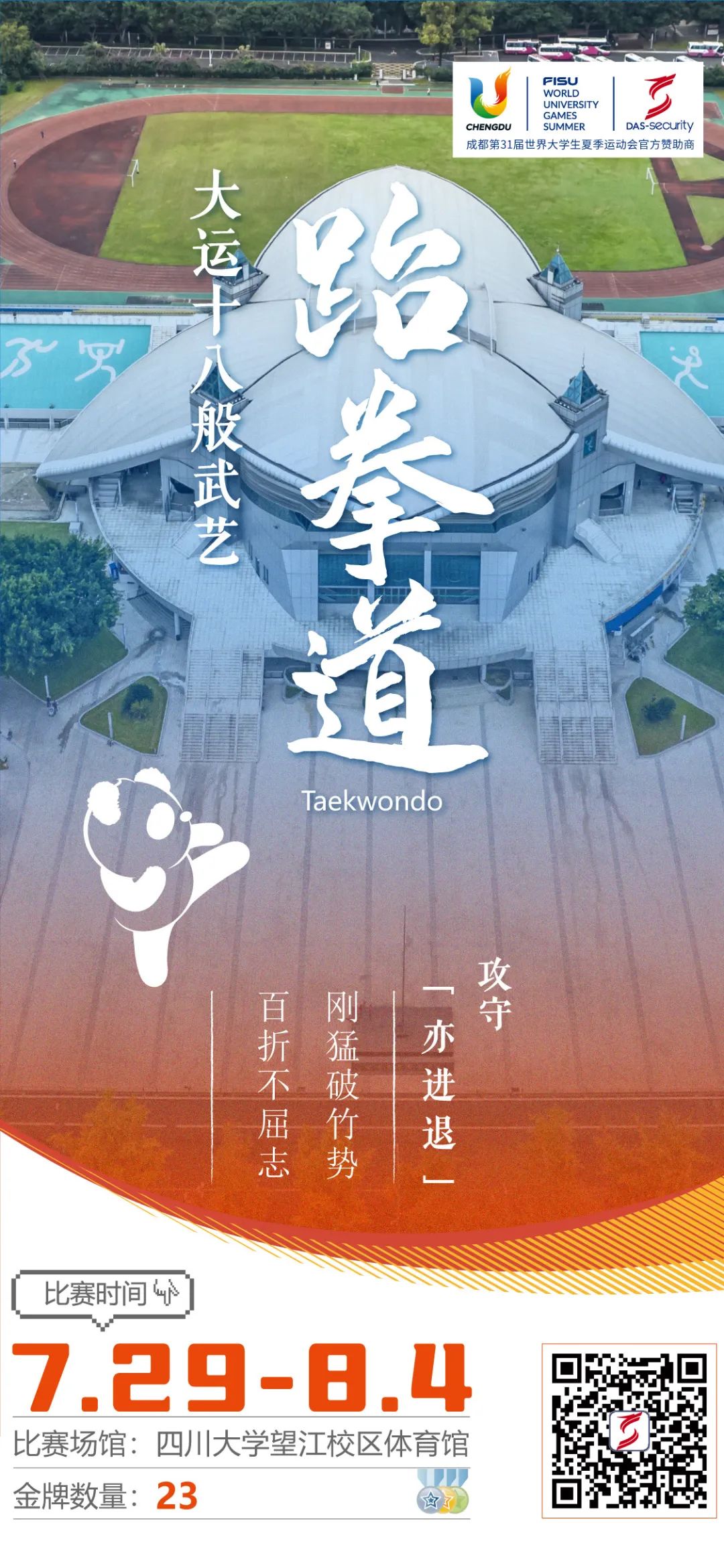 跆拳道起源于朝鲜半岛,距今已有两千多年的历史,经过东亚文化的发展,以“始于礼,终于礼”的武道精神为基础。本届大运会中跆拳道赛事将持续7天,包括竞技赛、品势赛两大类别,共计产生23枚金牌。