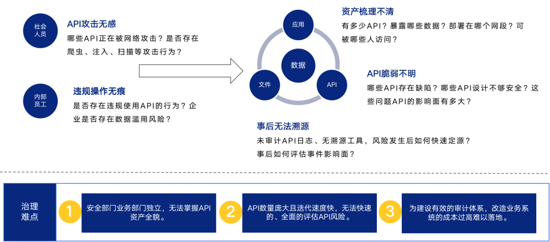 1. API数量激增导致管理困难:仅集团内部对外暴露的 API 数量就达到了 2W+,缺乏有效的手段梳理 API 资产清单,存在存量资产管理不当的安全隐患。