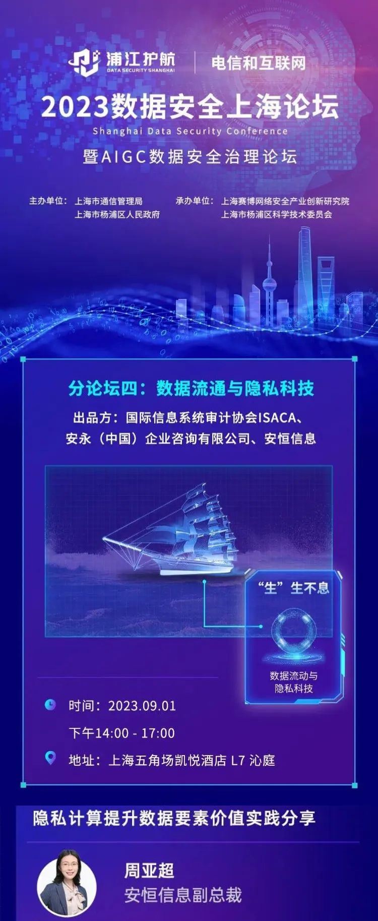 9月1日,2023数据安全上海论坛暨AIGC数据安全治理论坛将在上海举办,安恒信息作为大会联合承办单位受邀参会,共同出品“生”生不息——数据流通与隐私科技论坛。