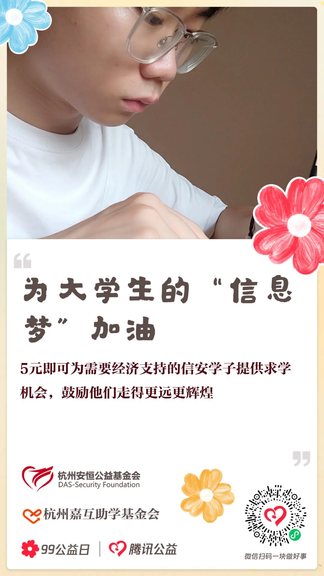 99公益日是由腾讯公益发起的目前国内影响最大的、参与人数最多的全民公益盛事之一。正逢99公益日九周年之际,安恒公益基金会首次参与99公益活动,与杭州嘉互助学基金会、腾讯公益联合开展“恒爱筑梦 星火励学”,为需要经济支持的信安学子提供求学机会,鼓励他们走得更远更辉煌。而安恒公益基金会的步伐远不止于此,从往昔走来,更迈向未来。