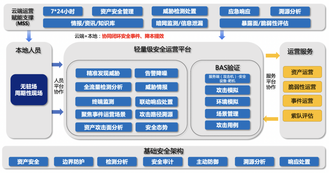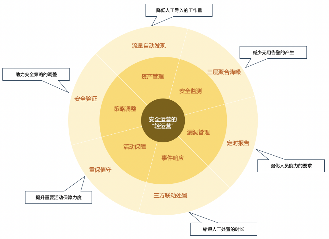 对于“轻运营”定义,可以这样理解:“轻运营”是以资产为核心,基于安全运营平台,建立一套实时的资产风险模型,实现自动化或半自动化事件风险分析、预警和处置闭环的集中安全管理体系。其中关键点有两个:1)自动化或半自动化;2)流程要闭环处置。在世界范围,尤其在中国,中小企业、医院、高校等单位还是占大多数,而这些单位信息化运营人员都少之又少,更何况安全运营人员?如果有一套安全产品能帮助企业摸清家底、度量安全水平、自动化或半自动化的闭环处置掉当天的事件,做到“今日事,今日毕”,那无疑是有价值的。