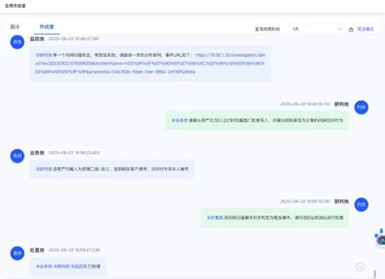 提供实时的交流协作线上平台,应急事件发生时一键拉起协同应急作战室,三线安全运营专家快速接入平台,实现安全事件快速响应、高效协同,同时一键生成事件处置报告,方便事后回溯、分析、横展等工作的开展。