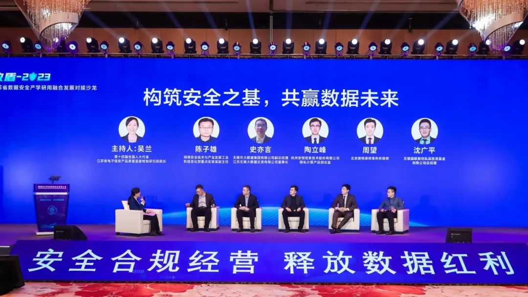 在“数盾-2023”江苏省数据安全产学研用融合发展对接沙龙上,举行了圆桌会议环节,邀请专家学者,围绕数据交易流通进行专题研讨。安恒信息隐私计算产品部总监受邀参与,就“数据要素流通安全保障”和“具体行业领域数据安全防护与数据要素利用”等问题提出见解。