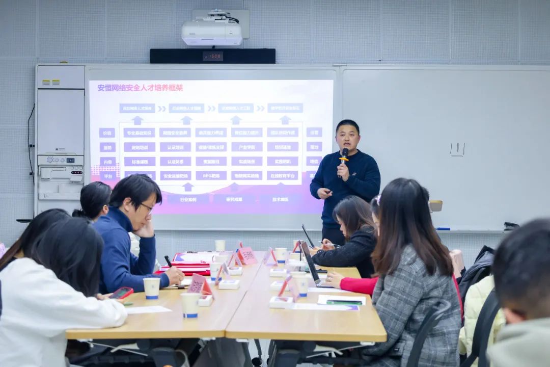 吴鸣旦介绍道,为响应国家在网信人才培养方面的有关要求和高校求实创新需求,安恒信息以自身行业资源、产业背景和技术积累为基础,于2016年成立安恒数字人才创研院,并将人才战略作为公司发展三大战略之一。同时,他还对网络安全人才培养总体框架、体系作了介绍,并详细说明了重保网络安全卫士的培养方案、途径、案例和成果等。