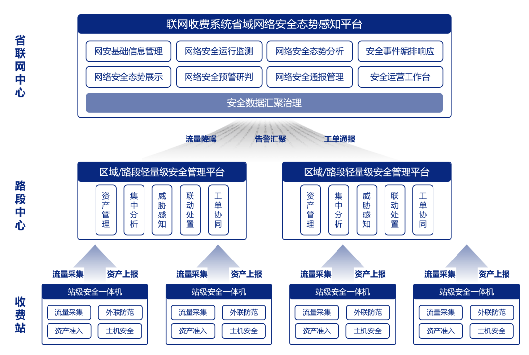 针对收费公路联网收费系统网络安全态势感知平台体系建设中存在的态势感知能力未覆盖至收费站等问题,安恒信息基于“省中心-区域/路段中心及ETC发行单位-收费站”的三级架构,省联网中心部署一级态势感知平台,区域/路段中心及ETC发行机构部署二级态势感知平台,多级部署,级联协同,通过联网收费系统网络安全态势感知系统升级方案,以满足省中心高速公路管理单位与路段中心业主不同的安全管理诉求。