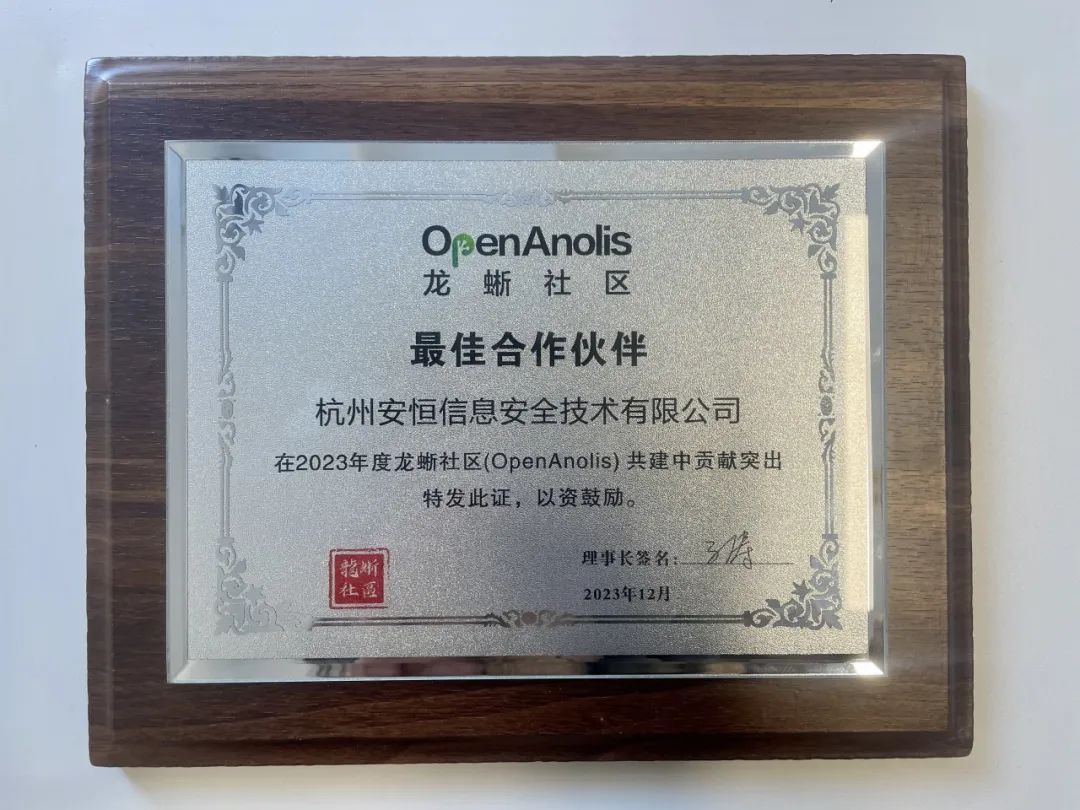 安恒信息作为openEuler社区的OSV厂商,持续参与社区的技术互动交流,参与sig组议题讨论,并积极提交社区贡献。12月底参加操作系统大会暨统信生态大会,发表主题演讲并共同发布统信安全威胁防御报告、发布信创一体机。同时作为安全厂商,已加入银河麒麟软件安全生态联盟和龙蜥安全联盟,成为龙蜥社区安全联盟首批成员单位,并在2023 龙蜥操作系统大会中荣获“龙蜥社区最佳合作伙伴”。