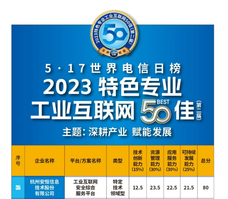 ➣在2023特色专业工业互联网50佳榜中,凭借工业互联网安全综合服务平台荣登榜单第35名。