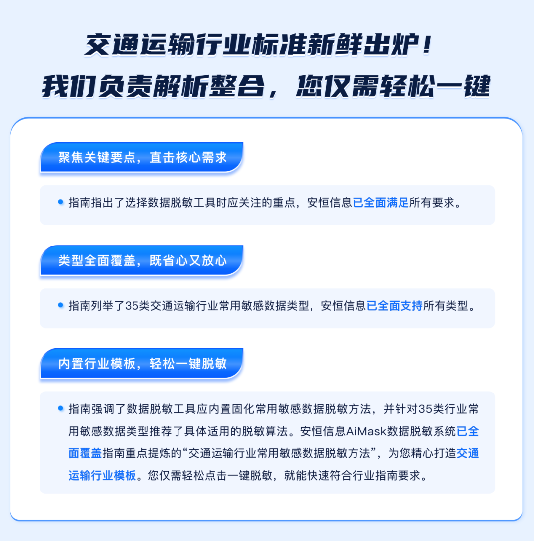 安恒信息AiMask数据脱敏系统在交通运输行业有丰富的数据安全实践经验,近年来在某省交通运输厅、某联合电服等数十个行业标杆案例落地实践的数据脱敏效果收获用户的一致认可。