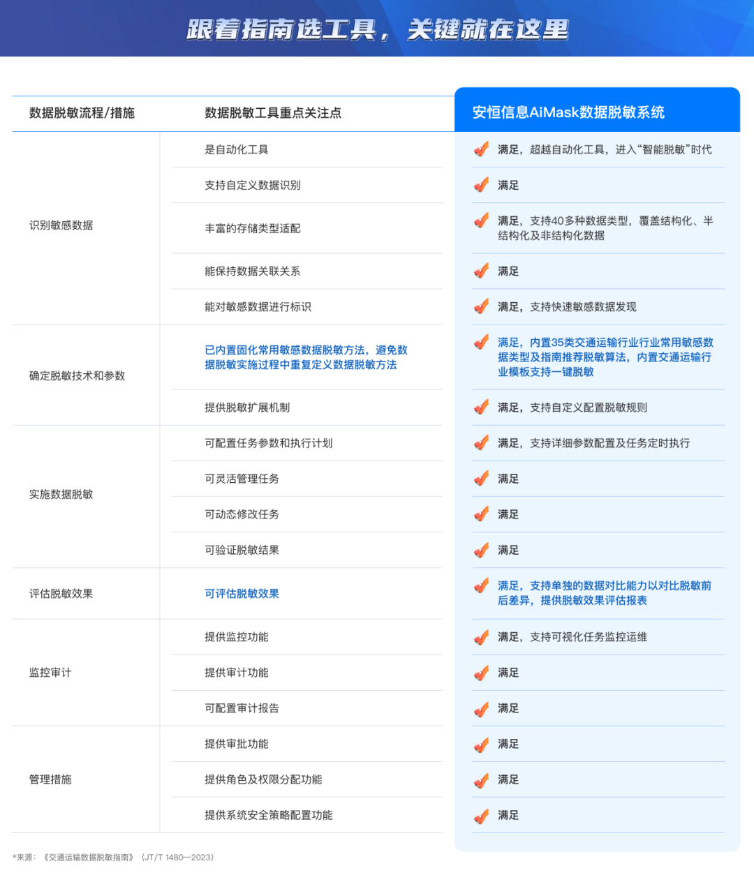 针对具体流程及措施,本标准提出了十余项选择数据脱敏工具时的重点关注点/满足项(详见文末),并强调了选择的数据脱敏工具宜内置固化常用敏感数据脱敏方法,避免数据脱敏实施过程中重复定义数据脱敏方法。