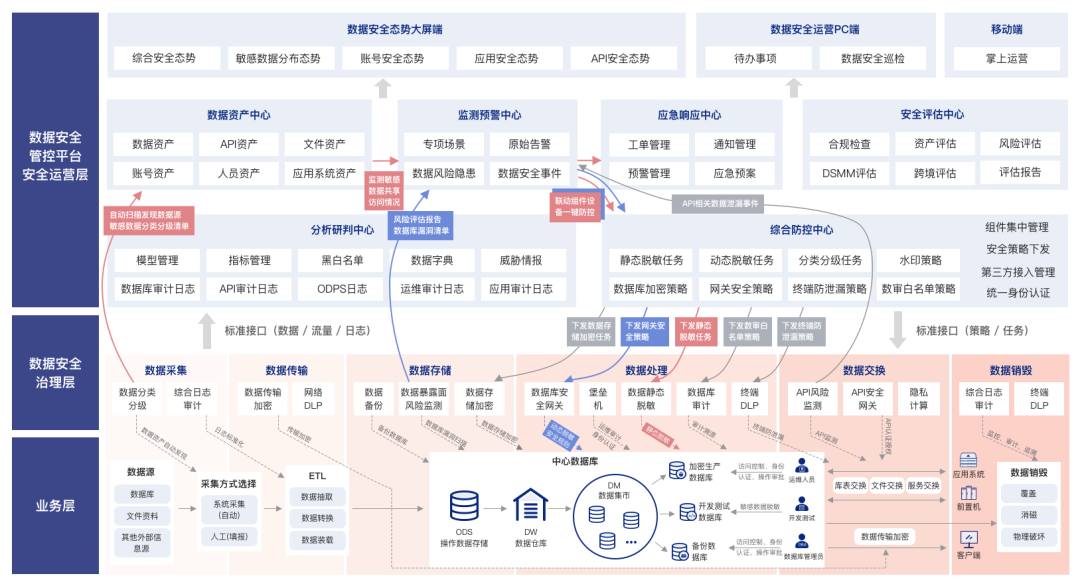 该平台利用复杂系统建模方法和大数据智能分析,提供流动数据风险治理、数据安全合规监管能力。从数据、接口、人员三个视角建立规则模型,对数据归集、处理、共享、交换场景下的数据风险进行全域治理和合规监管,对发现的数据安全风险进行及时预警和通报,建立适应数据动态流动的安全管理机制。以平台为基础工具,帮助客户建立了数据层面从资产识别、安全防护、监测预警、响应处置到安全合规的数据安全监督管理闭环。