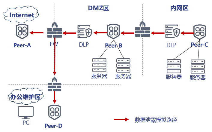 数据泄露风险评估在用户网络不同安全域之间建立评估任务,采用多种数据外发方法进行敏感数据外发测试。敏感数据类型覆盖个人信息、源代码、文档文件等,通过绘制数据泄露路径综合分析数据泄露风险,直观展示各安全域之间的数据外泄路径。