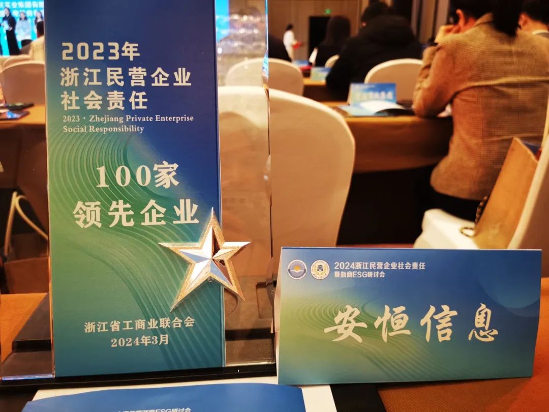 3月21日,由浙江省工商联、浙江工商大学共同主办的“2024浙江民营企业社会责任暨浙商ESG研讨会”举行。会上,安恒信息入选“2023年浙江民营企业社会责任100家领先企业”。