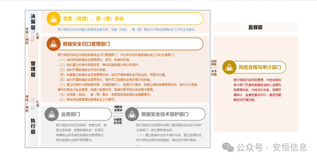 一是明确数据安全治理架构,通过责任制、归口管理部门、业务部门、风险合规与审计部门、数据安全技术保护部门的职责定义,明确组织架构分工。银行保险机构的科技部门,明确作为数据安全保护的技术支撑,非主责部门。