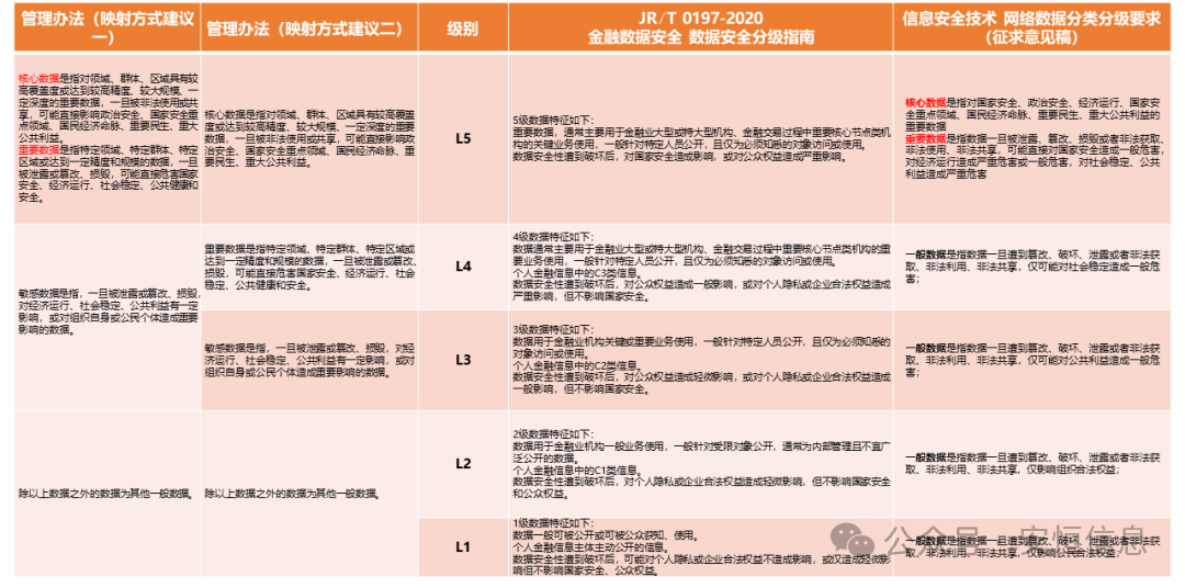要求银行保险机构制定数据分类分级保护制度,建立数据目录和分类分级规范,并采取差异化的安全保护措施。将数据分为核心数据、重要数据、一般数据。其中,一般数据细分为敏感数据和其他一般数据,对照之前的监管发文要求,建议可采取以下映射思路进行分级工作。