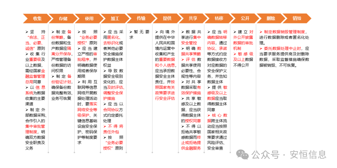 要求银行保险机构建立数据安全技术架构,明确数据保护策略方法,采取技术手段保障数据安全。将数据安全保护纳入信息系统开发生命周期框架,针对敏感级及以上数据明确安全保护要求,实现数据安全保护措施与信息系统的同步规划、同步建设、同步使用。建立数据安全保护基线,把数据纳入网络安全等级保护,对存放或传输敏感级及以上数据的机房、网络实施重点防护,在数据全生命周期内采取有效访问控制管理措施,通过整体安全有效的措施方式保障数据完整性、保密性、可用性。