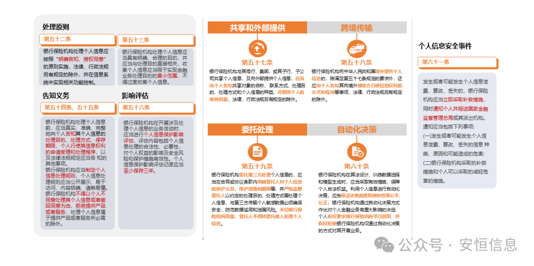 五是加强个人信息保护,除延续《个人信息保护法》中的处理原则、告知义务、个人信息影响评估、委托处理、个人风险报告等要求外,明确提出个人信息跨境场景下,需向个人告知,所属银行保险机构向境外接收方行使信息权利的方式和程序。