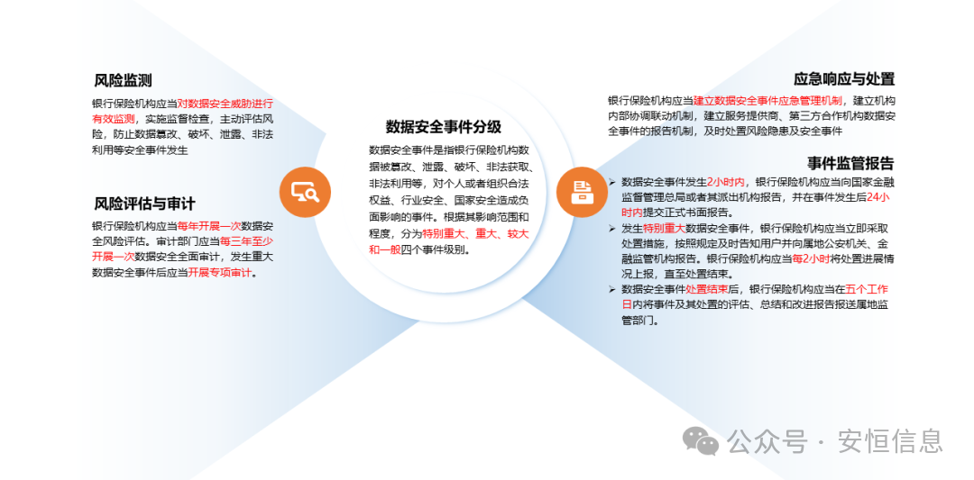 六是完善数据安全风险监测与处置机制。将数据安全风险纳入全面风险管理体系。要求银行保险机构明确管理流程,主动评估风险,对数据安全风险进行有效监测,防止数据破坏、泄露、非法利用等安全事件发生。风险管理、内控合规和审计部门定期对数据安全开展审计、监督检查与评价。