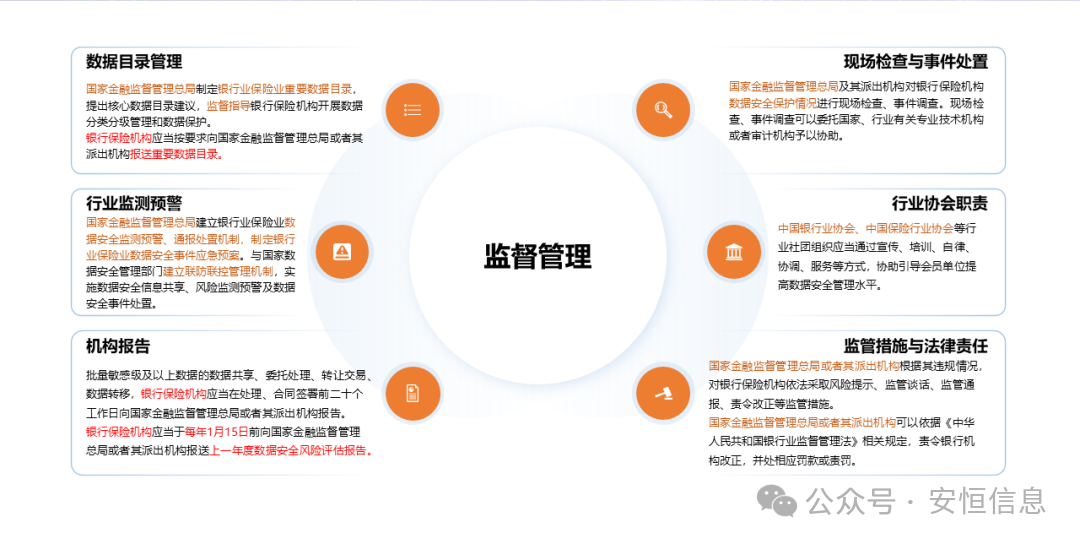 七是深化监督管理职责,监管机构将通过非现场监管和现场检查相结合的方式,明确将数据安全管理情况纳入监管评估评估体系,大大提升监管力度。同时加强监管统筹和行业联防联控,统一管理重要数据目录,实现银行保险业数据安全监测预警、信息共享、联动处置。针对监管措施和法律责任进行了细化,包括风险提示、监管谈话、监管通报、责令改正、责令暂停或终止服务、罚款。