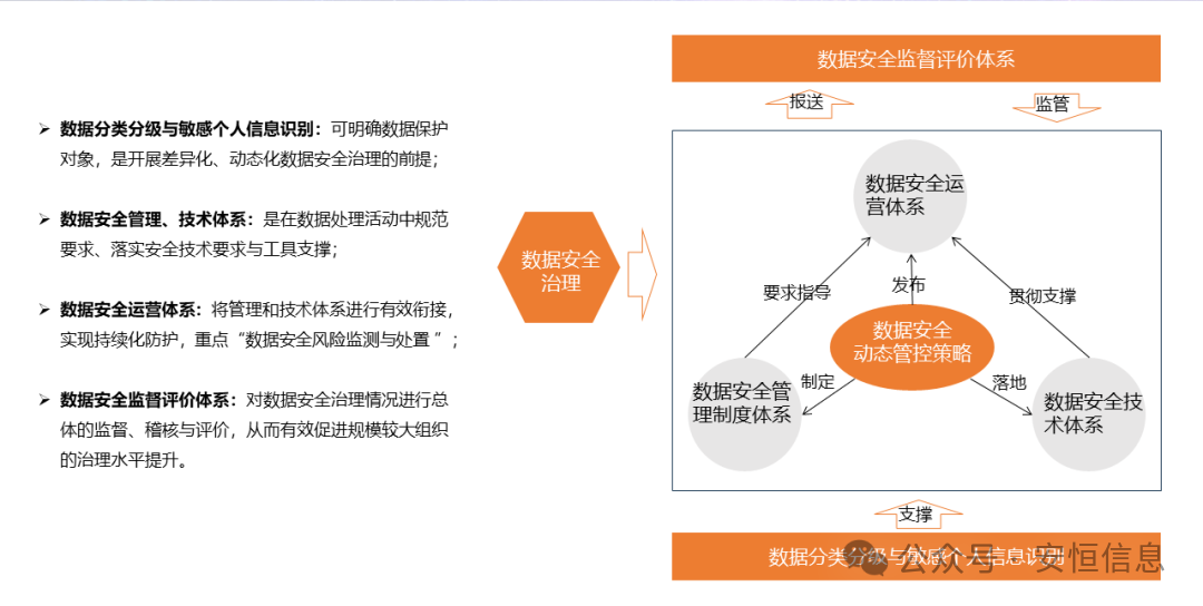 《办法》通过管理、技术、(数据安全风险监测与处置、监督管理)运营体系三位一体、有机融合,形成以动态数据安全管控策略为中心,管理体系为驱动,运营体系为纽带、技术体系为落地支撑的治理核心。