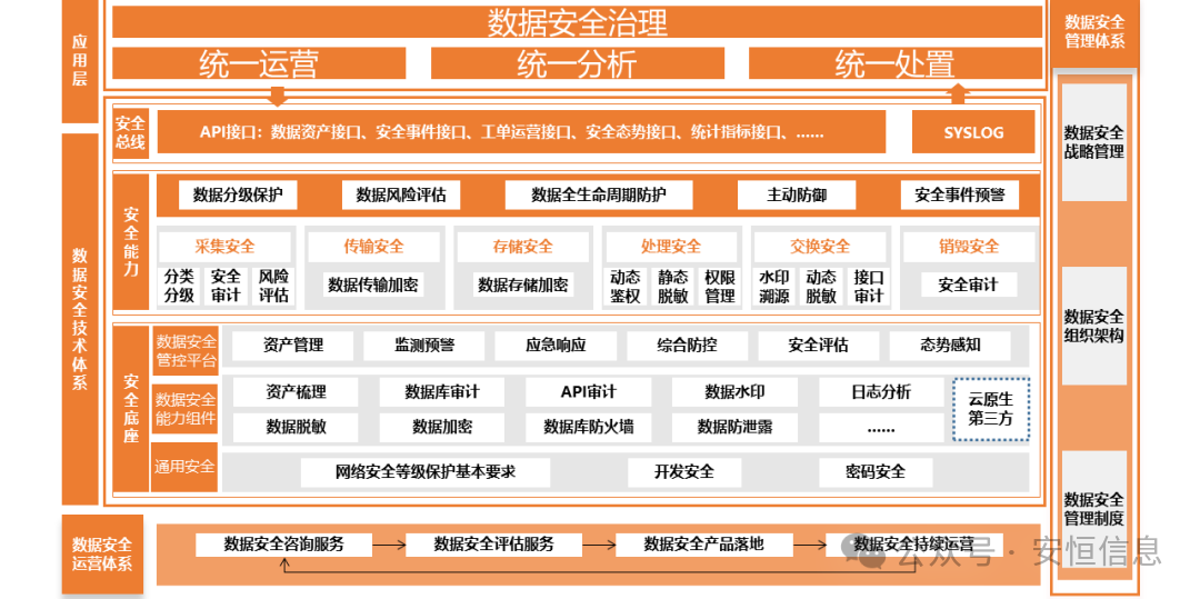 安恒信息通过多年来积极参与国家网络安全与数据安全标准规范的制定,持续投入数据安全能力研发资源,以及参与大量客户的数据安全体系规划、建设落地到运营的实践经验,全面提出安恒数盾数据安全治理整体框架。框架基于管理、技术、运营一体化的“三位一体”建设理念,结合数据安全三体系蓝图框架,清晰明确数据安全技术架构设计、数据安全治理、能力建设和持续运营的目标、实现路径、工作任务和实践指引。