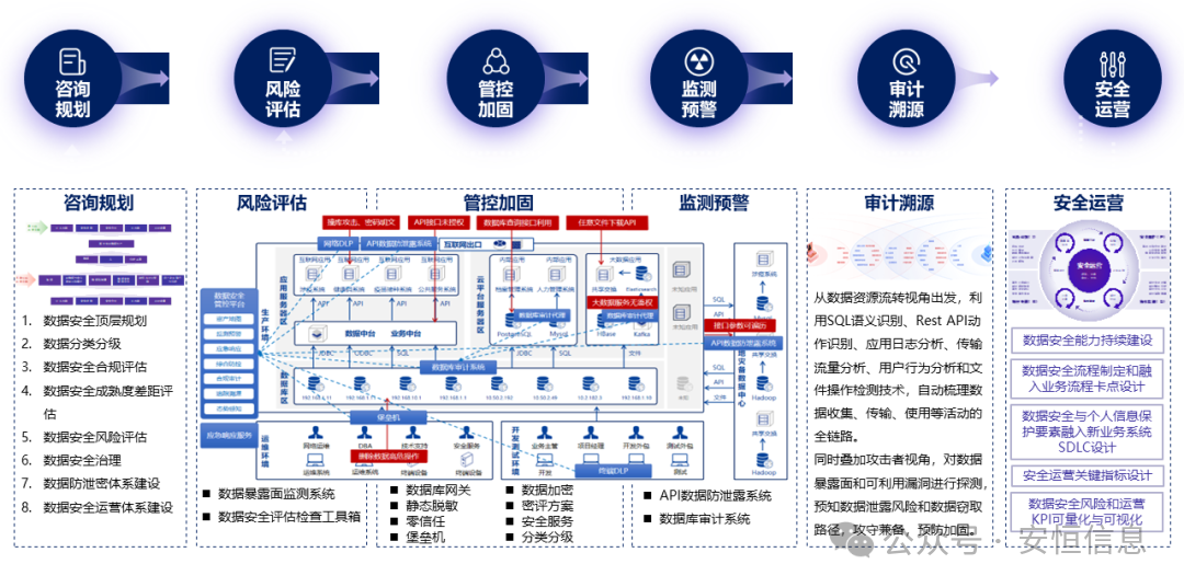 通过咨询服务与底层产品、对应的技术能力与平台支撑,按照咨询规划、风险评估、管控加固、监测预警、审计溯源、安全运营的落地步骤来全面落实数据安全动态管控策略与安全风险监测处置,确保数据安全工作的合规性,切实保障金融行业数据资产的整体安全。