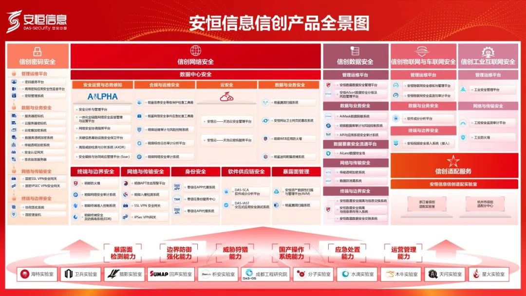 当前,安恒信息在信创领域上实现重大突破,已实现基础网络安全产品、云安全产品、大数据安全类产品、商用密码产品、SM产品的全面突破,形成网络安全、数据安全、商用密码应用等综合信创解决方案,实现 67 个品类 200余款型号的国产化规格适配。