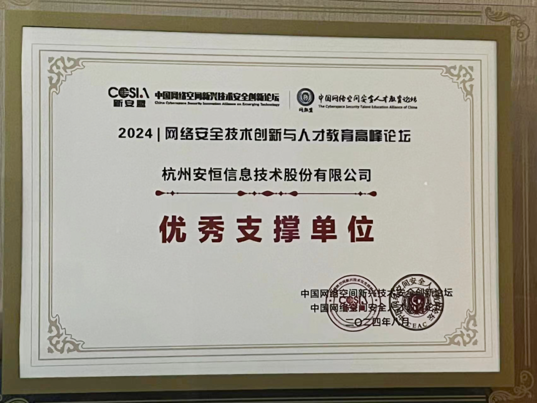 此外,安恒信息获评2024网络安全技术创新与人才教育高峰论坛优秀支撑单位。