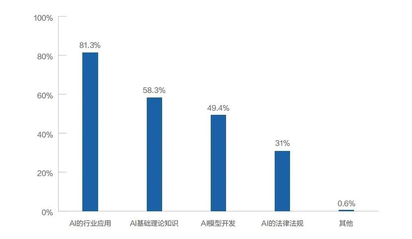 报告提到,目前既精通AI技术原理又熟悉安全策略、数据隐私保护及伦理法规的复合型人才炙手可热。在对受访者关于人工智能安全培训内容的调研中,有81.3%的从业人员最关注AI的行业应用,对AI基础理论知识、AI模型开发也有着较为迫切的培训需求。