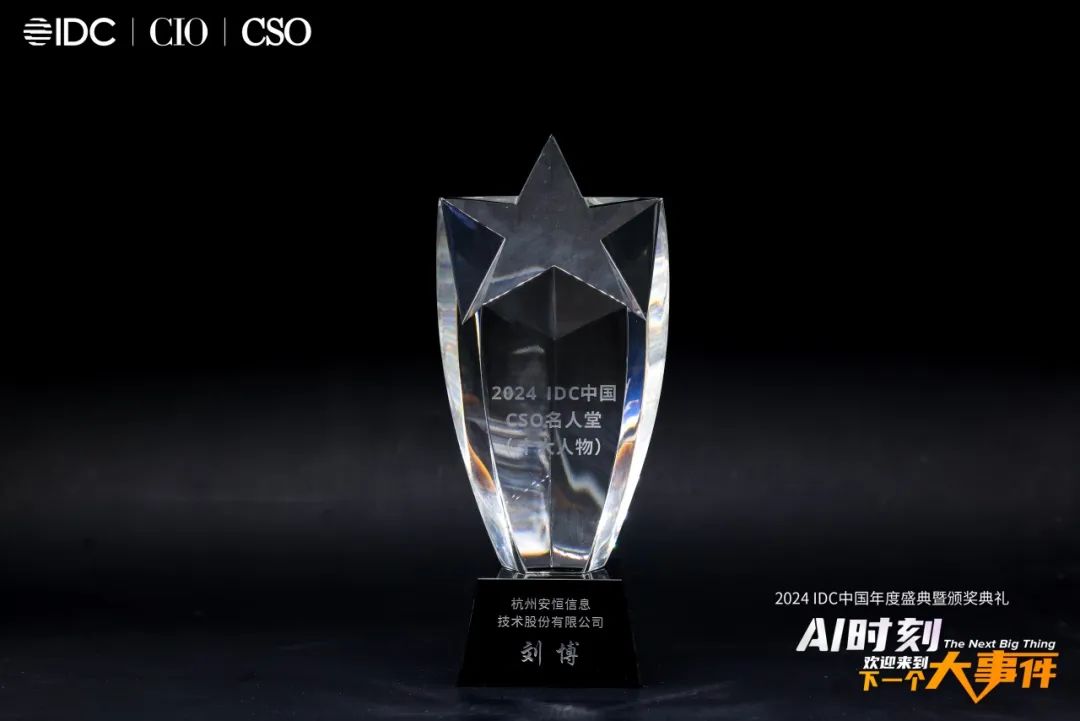 会上,安恒信息CTO刘博荣誉入选“2024 IDC中国 CSO名人堂 (十大人物) ”。