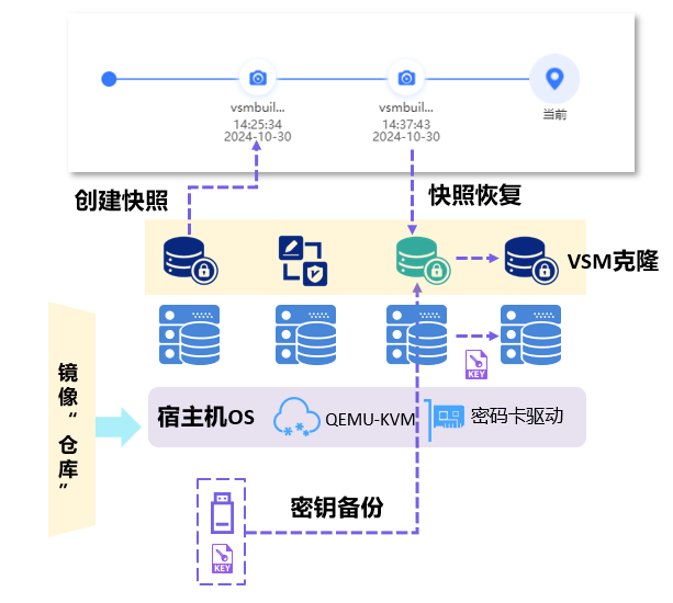 在密码服务调用高峰期时,管理员可灵活进行CPU/内存资源动态调整,纵向扩容单个VSM服务负载能力;亦可指定某个VSM通过影像迁移来扩展密码服务数量,增强密码服务的负载能力。
